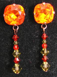 Chaque boucle d'oreille est composée d'un cabochon carré Swarovski de couleur FireOpal (orangé aux reflets rouges) serti avec une suspension de perles et toupies Swarovski, dans les tons hyacinth et kaki.