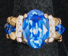 Une bague au superbe cabochon ovale en cristal Swarovski bleu Saphir encadré de barrettes de strass, et de toupies Saphir.