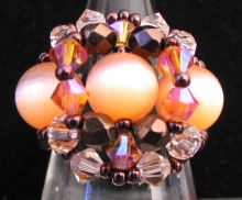 Tonalité ambre pour cette bague aux toupies Swarovski (les belles Topaz Ab2x, les douces Silk), encadrées de facettes en cristal bronze foncé et éclairées de perles oeil-de-chat orange clair.