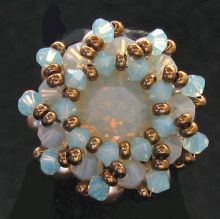 Une bague ronde de taille moyenne montée à partir d'un cabochon Swarovski carré de la belle couleur Sand Opal et serti par des toupies et des perles nacrées Swarovski.
