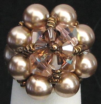 Tendres couleurs pêche pour cette bague à la forme géométrique qui met en scène des perles nacrées et des toupies en cristal Swarovski de belles tailles 6 et 8mm, associées à des rocailles fines "bronze doré".
