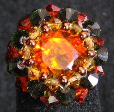 Un cabochon carré Swarovski couleur de feu est mis en contraste par une sertissure faite de petites et moyennes toupies Swwaroski dans les tons kaki, vert foncé, et la version satin de la couleur Hyacinth. Fines rocailles bronze doré.