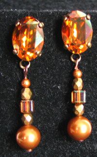 Chaque boucle d'oreille est composée d'un cabochon ovale Swarovski de couleur Crystal copper (cuivre) serti avec une suspension de perles nacrées Swarovski, couleur Copper, d'un cube en cristal encadré de facettes bronze dorées.