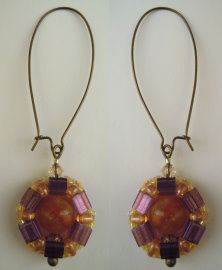 Les boucles d'oreille de la parure Somerset Orange ambrée : en perles Tila et Twin beads, des médaillons double-faces à la forme géométrique d'hexagone réhaussés d'une perle centrale naturelle en Red Sardonyx dans des couleurs pêche/cuivre nacré, amethyste métallisé...