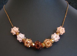 Les boules de toupies sont réalisées en toupies Swarovski sur 4 tons depuis le sombre Smoke topaz jusqu'au tendre Silk, puis enfilées sur un cordon en coton chocolat. Chaque boule est séparée de la suivante par une grosse perle à facette bronze doré.